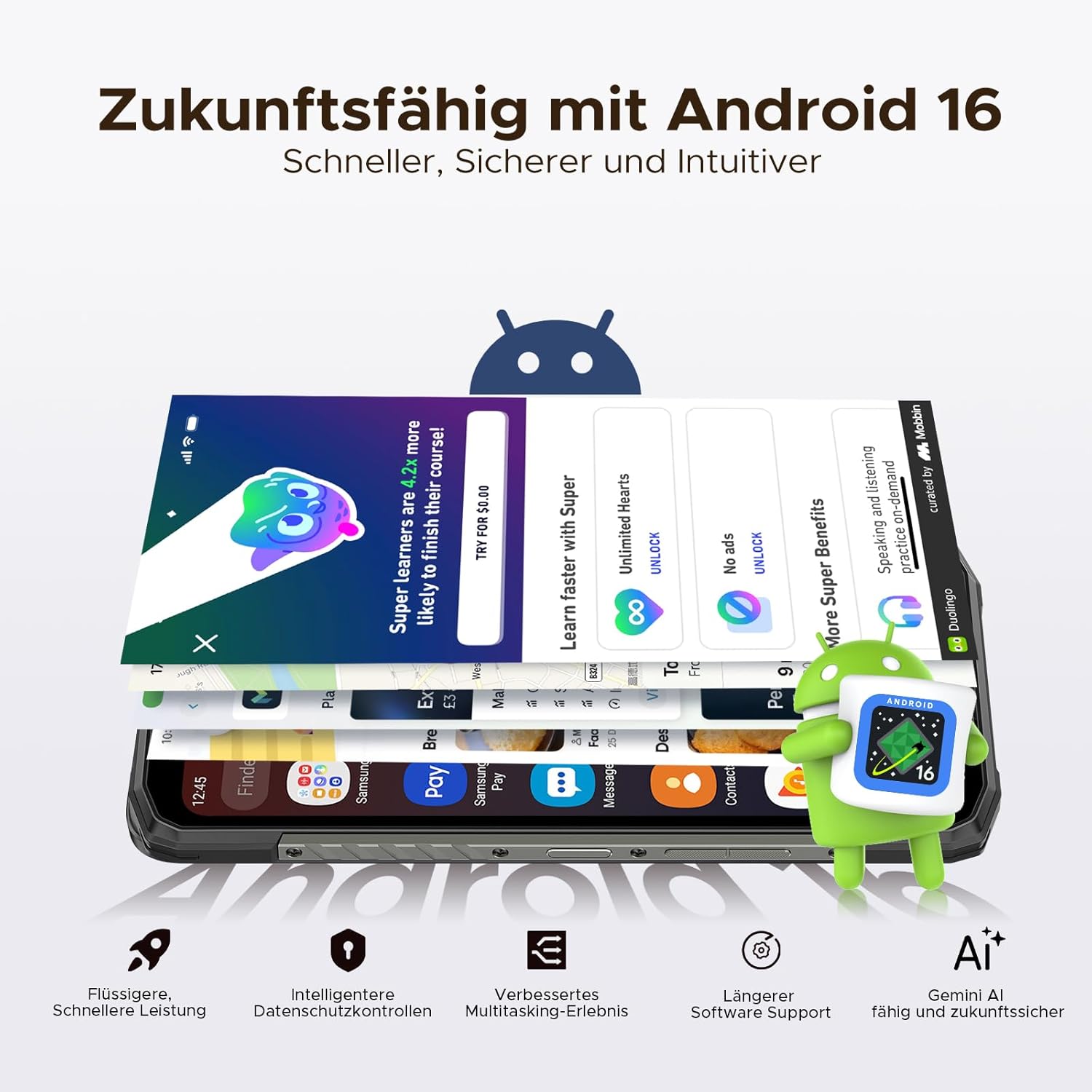 Das DOOGEE Blade10 Power läuft mit dem neuesten Android 16-Betriebssystem, das eine verbesserte Benutzerfreundlichkeit, Datenschutz und individuelle Anpassungsmöglichkeiten bietet. Die intelligente Gemini AI-Funktion ermöglicht Multitasking und optimiert automatisch verschiedene Geräteaktivitäten, um ein reibungsloses Benutzererlebnis zu gewährleisten.