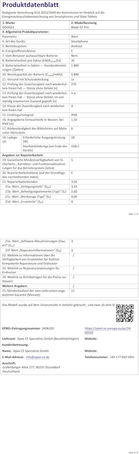 Insgesamt ist das DOOGEE Blade GT Pro 5G Outdoor Handy ein leistungsstarkes und robustes Gerät, das speziell für den Outdoor-Einsatz konzipiert wurde. Mit seiner hervorragenden Leistung, robusten Bauweise und vielfältigen Funktionen ist es ideal für Nutzer, die ein zuverlässiges und komfortables mobiles Erlebnis suchen.