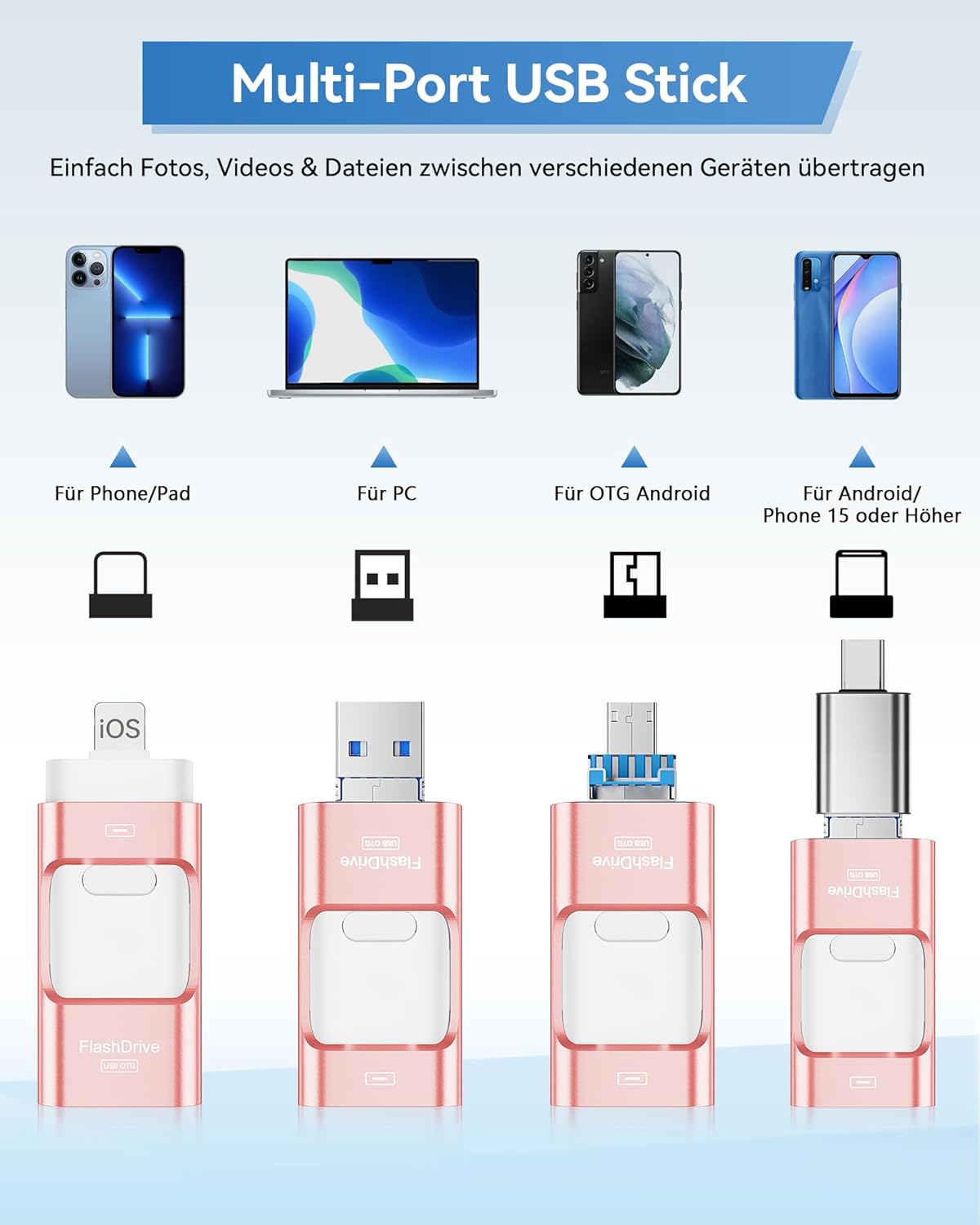 ZARMST 256GB USB Stick für Phone, 4-in-1 Speicherstick für Phone/Pad/Android Smartphone/PC, USB 3.0 Stick zur Schnellen Datenübertragung, Externer Vielseitiger Fotostick Flashlaufwerk, Rosa