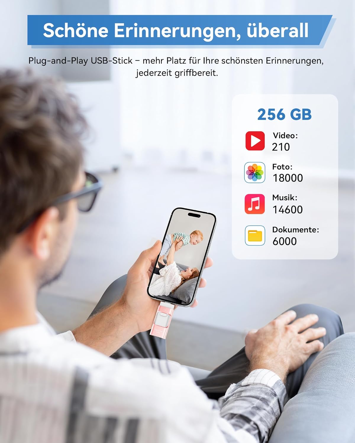 Der 256GB USB Stick für Phone bietet genügend Speicherplatz, um alle wichtigen Daten sicher zu speichern. Ob Fotos, Videos, Musik, Dokumente oder andere Erinnerungen – der Stick hält alle besonderen Momente übersichtlich und schnell zugänglich. Die Dateien können jederzeit aufgerufen und bei Bedarf einfach auf sozialen Medien geteilt werden, was ihn zu einem praktischen Begleiter für den Alltag, das Büro, Reisen oder besondere Anlässe macht.